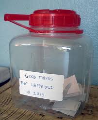 As 2012 was coming to an end, I saw many posts on Facebook for a great way to find the positive in 2013. It's basically taking a jar, and starting Jan 1, writing down good things that happen to you, and putting them into the jar. Then, on New Year's Eve 2013, read through the contents of the jar in order to help you remember all of the good things, big and small, that happened throughout the year.